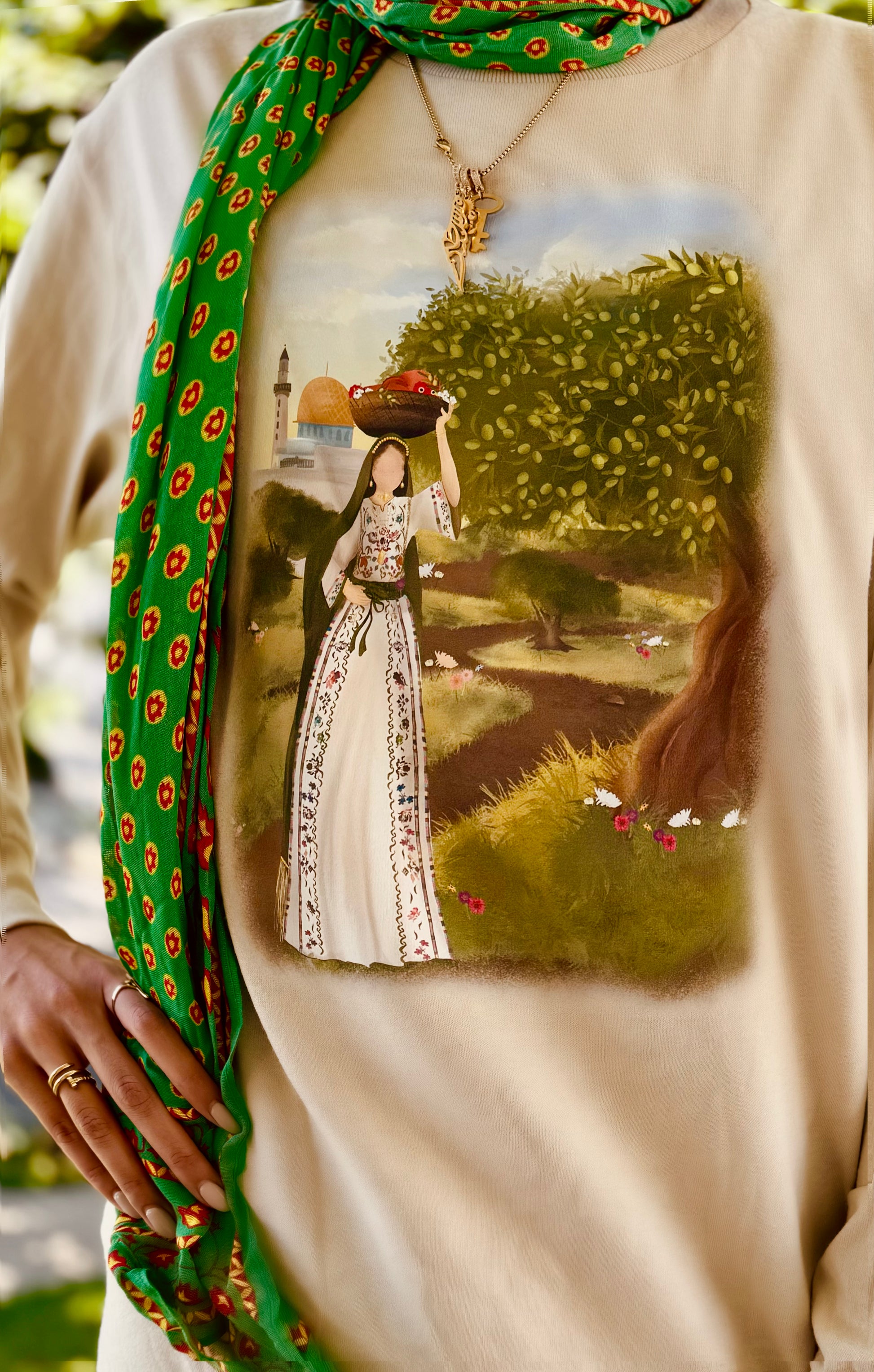 Tatreez Masjid Hoodie Through Olive groves and golden domes, she carries the fruits of the land -- a symbol of heritage,resilience and belonging
